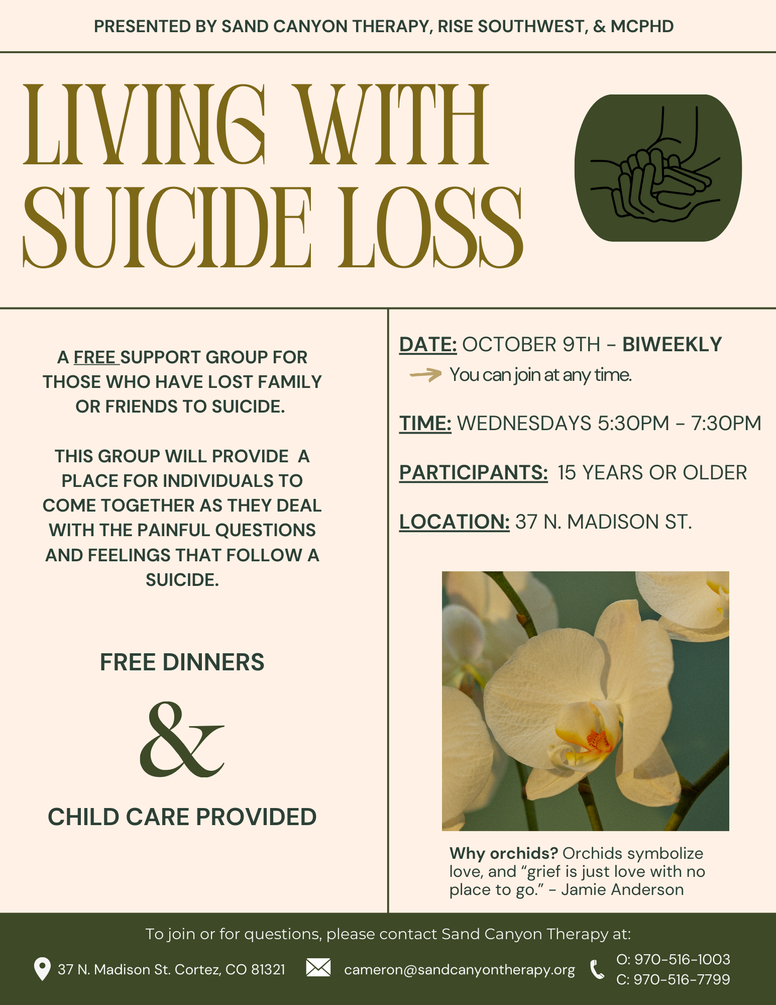 This group is tailored to family members or friends who have lost someone to suicide. It is a free support group in the hope of providing a place for individuals to come together as they deal with the painful questions and feelings that follow a suicide. Dinner and child care will be provided. Check out the flyer below for more details!